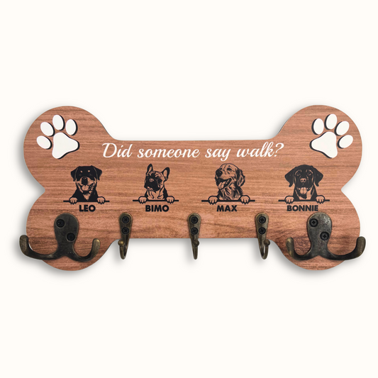 Did Someone Say Walk? – Personalized Dog Face Key & Leash Holder – Bone Shape Wooden Sign